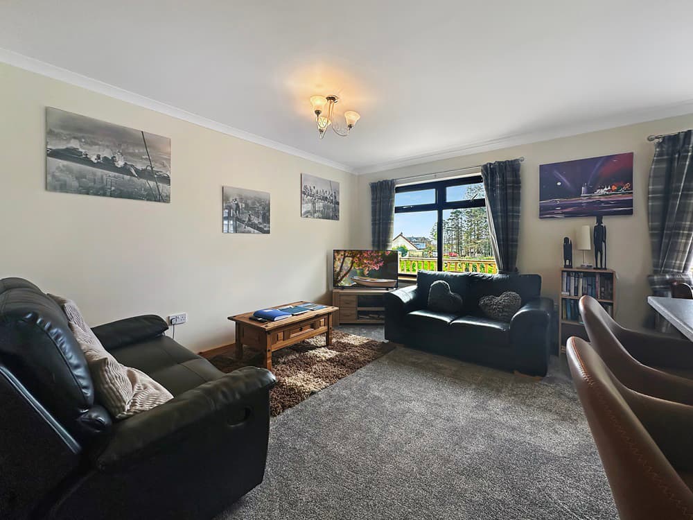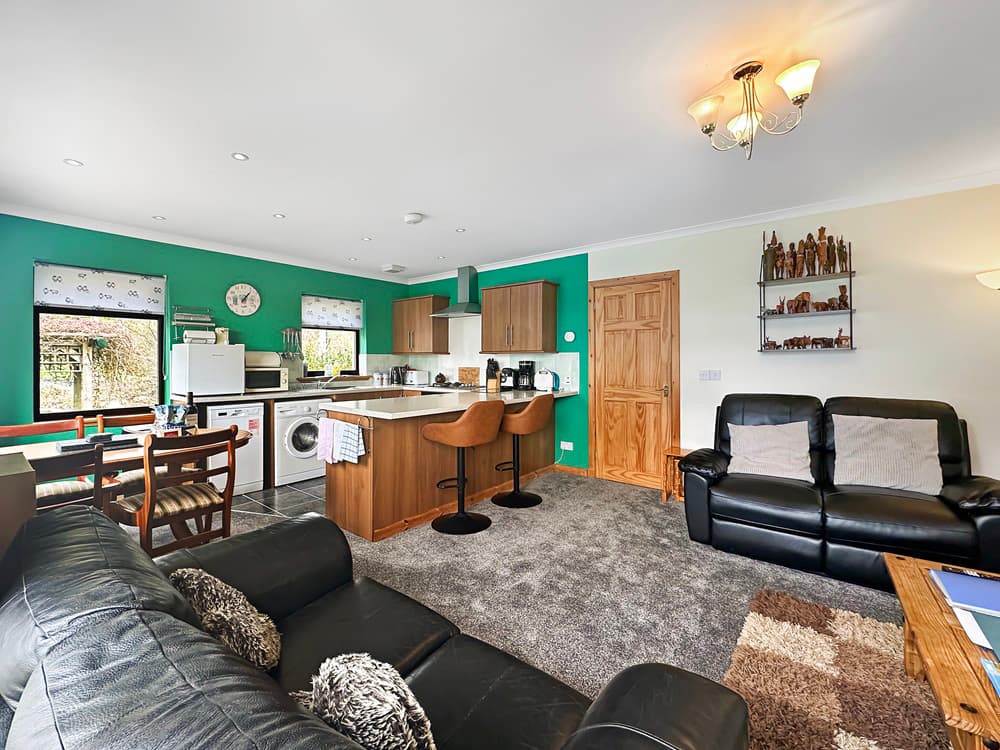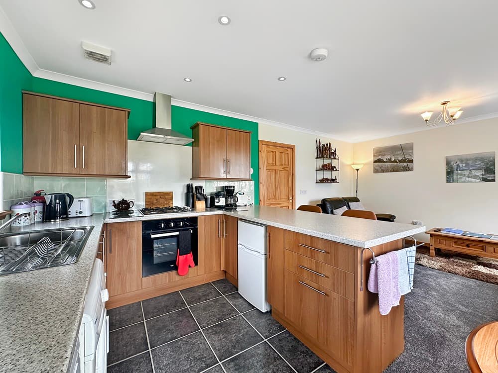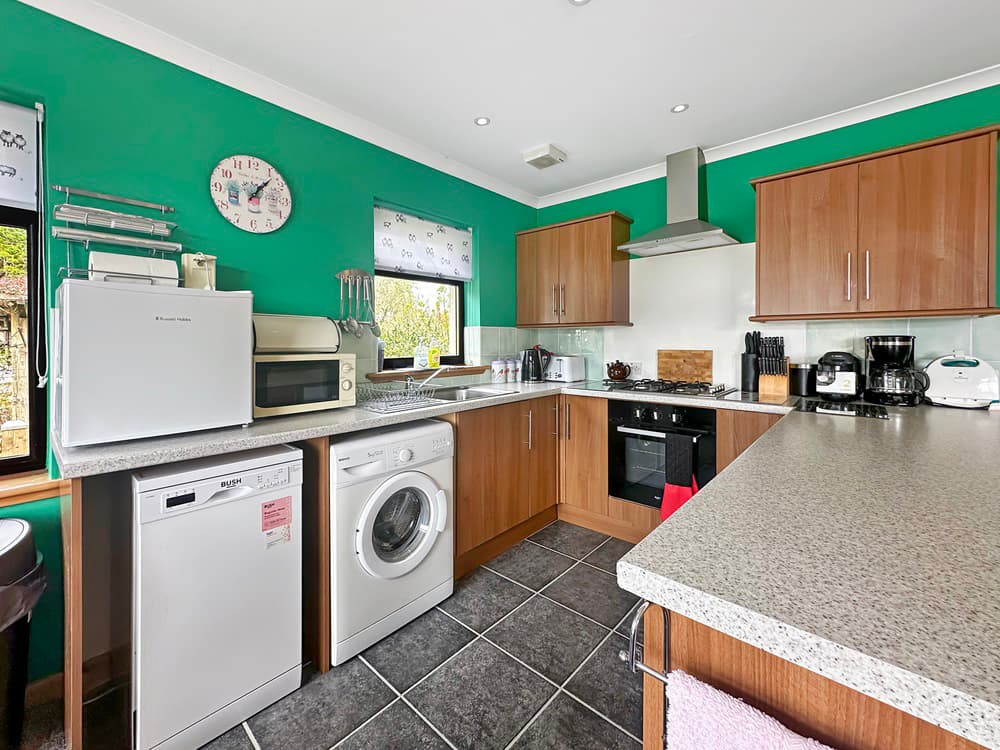 The kitchen area contains a  fridge, dishwasher, washing machine, gas hob, electric oven, extractor and microwave, while the dining area contains a wooden dining table and chairs. In the living area there is a CD player, freeview television and a DVD player.